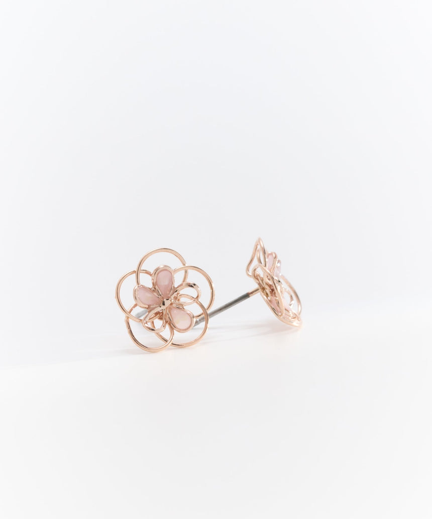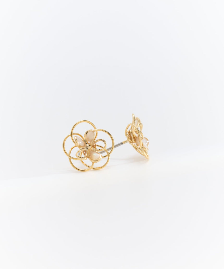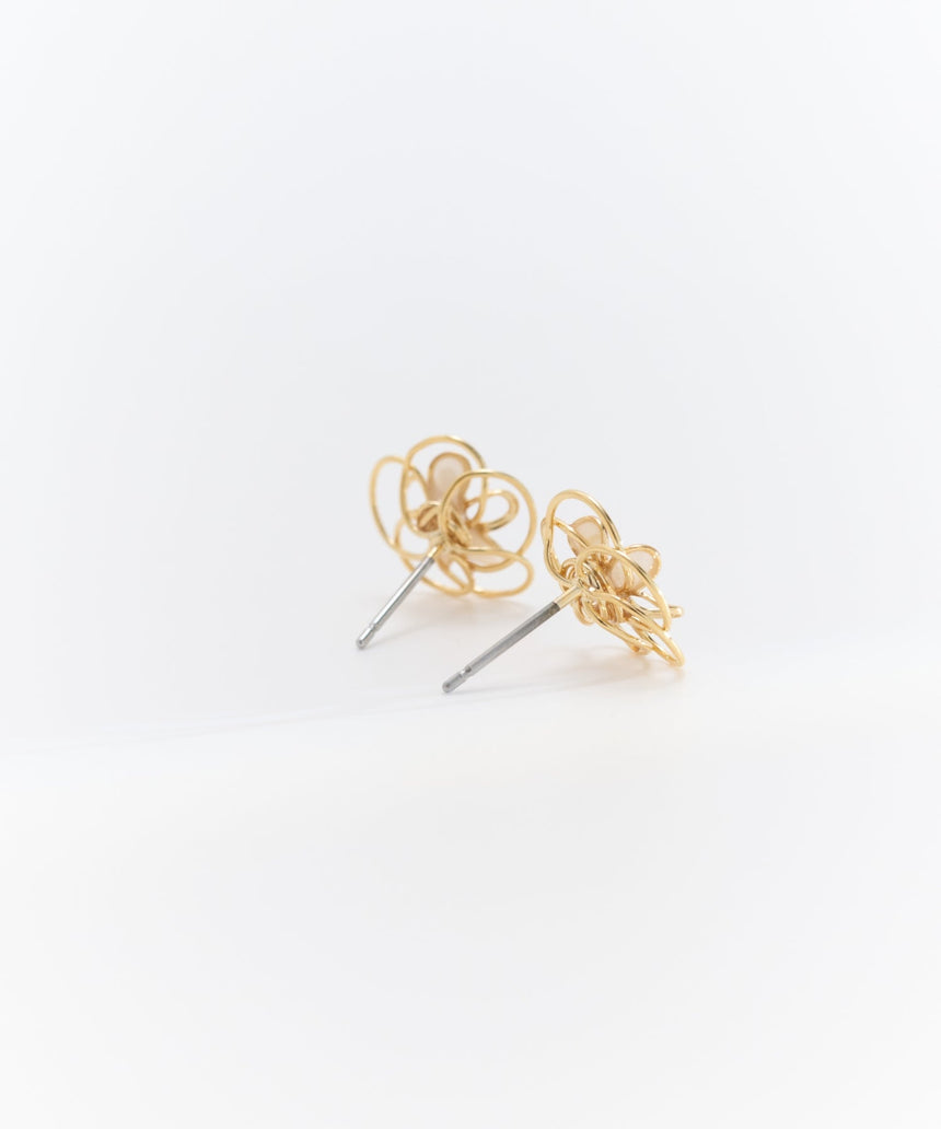 繊細なワイヤーで描いたフラワーモチーフに、パール風のビーズを添えたピアス。